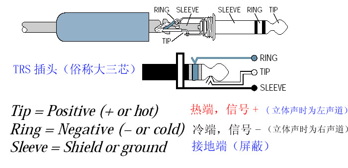二、卡農(nóng)轉(zhuǎn)大三芯線 卡農(nóng)轉(zhuǎn)大三芯線也是我們常用的一種線,它的接法類似于上面說的,只不過一邊用卡農(nóng)頭(公/母視情況而定)一邊用大三芯頭(又稱TRS插頭)。以卡農(nóng)公頭為例,如下圖: