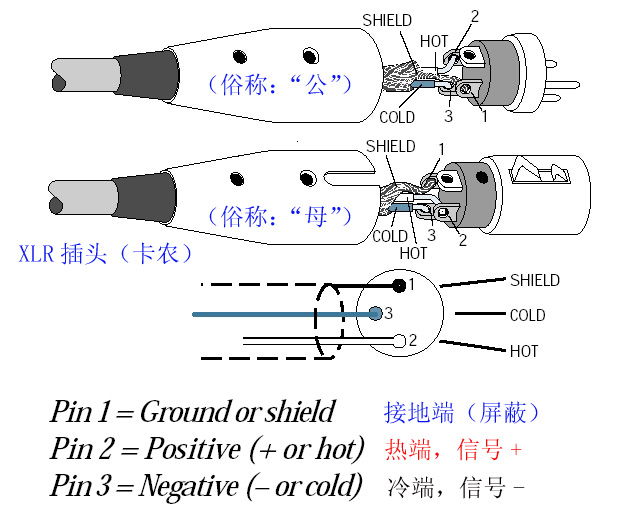 卡農(nóng)插頭分為兩種,公頭和母頭, 卡農(nóng)插頭(又稱XLR插頭)有3個端,分別是1、2、3、每個卡農(nóng)插頭上都會清楚的標(biāo)明。 一、標(biāo)準(zhǔn)的卡農(nóng)線 標(biāo)準(zhǔn)的卡農(nóng)線通常由1個公頭和1個母頭用雙芯線連接而成。線的屏蔽層焊接到1端(接地),2端和3端分別焊接到兩個線芯,這是平衡的接法。當(dāng)我們使用電容話筒時,就要使用這種線,此時幻像供電由3端送至話筒,話筒的信號則由2端送至調(diào)音臺或話放。當(dāng)然啦1端是接地的。